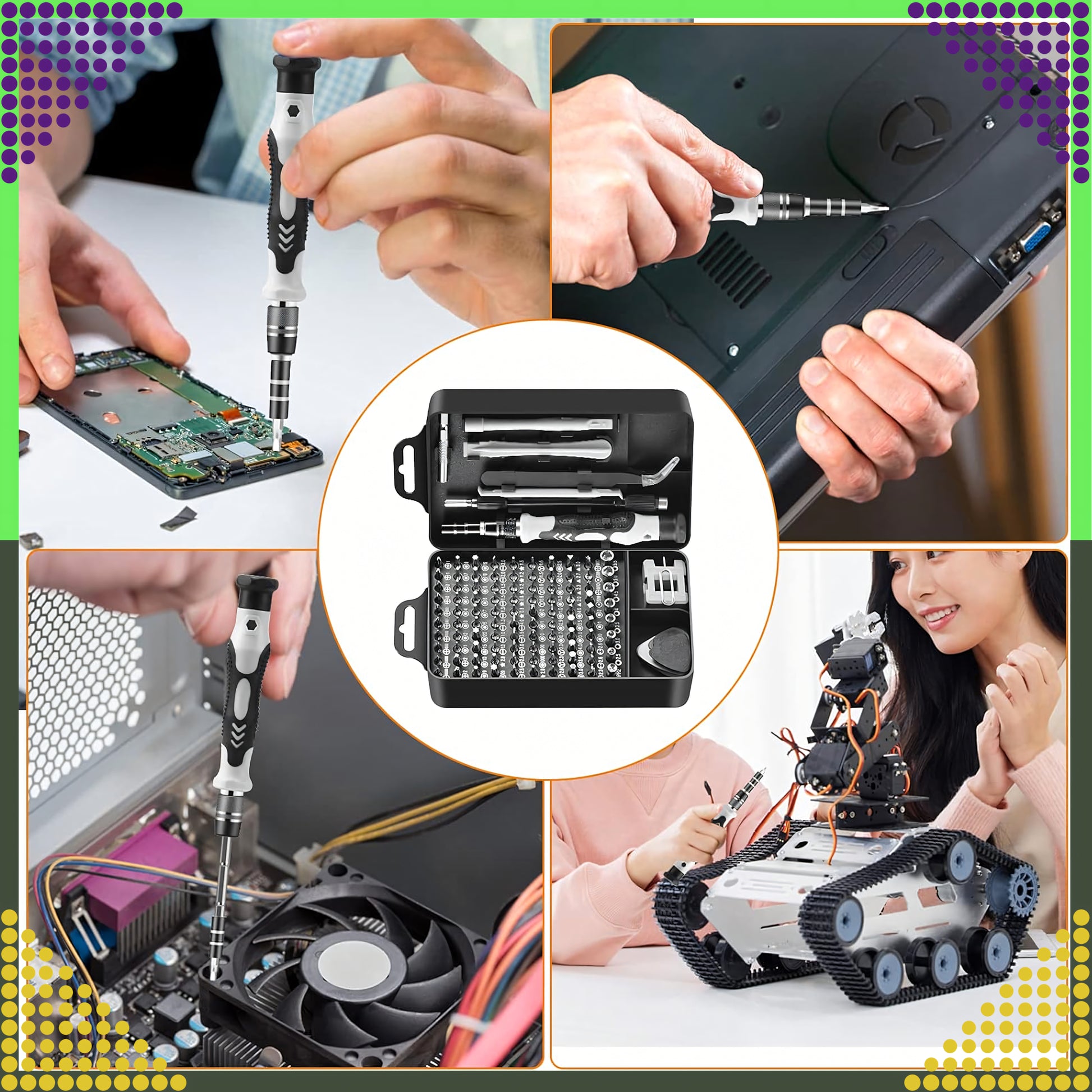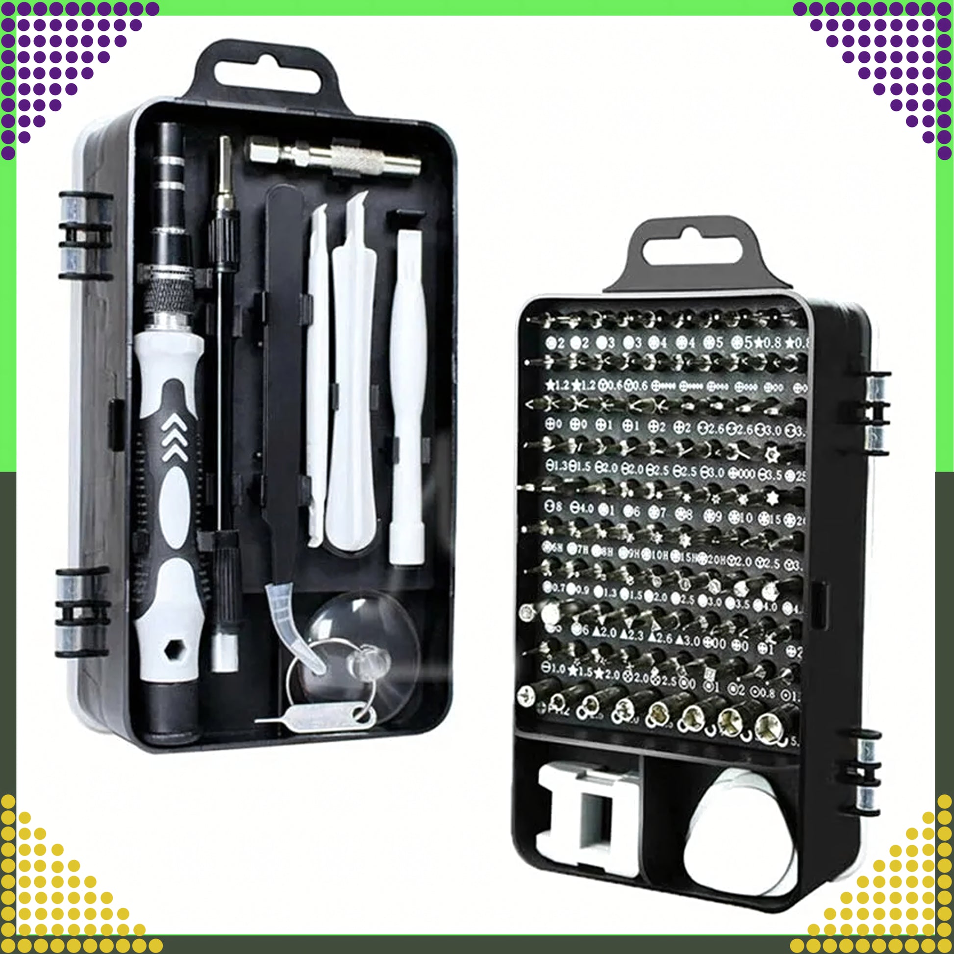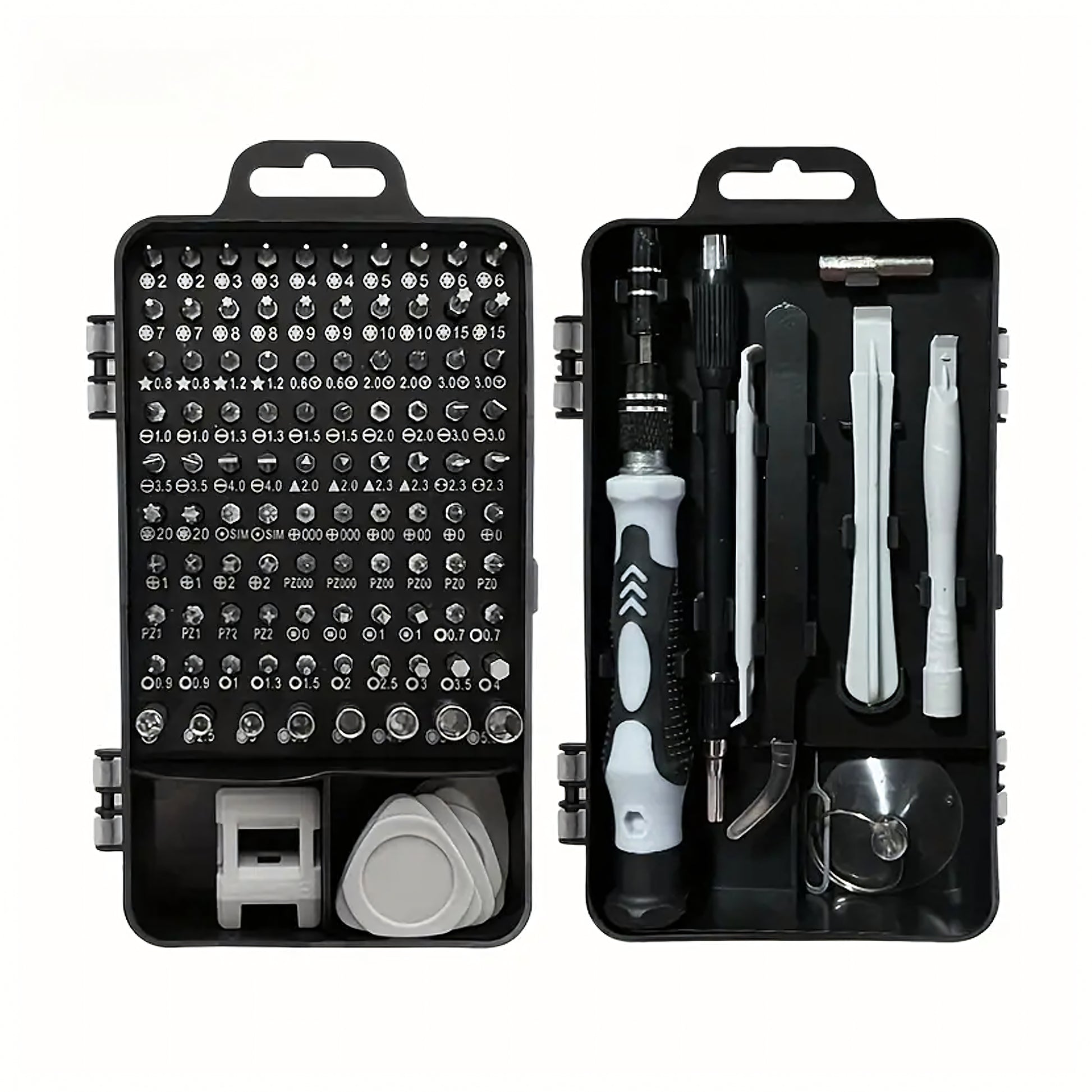 Mitmekülgne 115-osaline täppiskruvikeerajate komplekt katab enamiku peenmehhaanika ja elektroonika töödest: telefonid, sülearvutid, konsoolid, kaamerad, prillid, kellad, väikeseadmed. Magnetiseeritud otsikud hoiavad kruvid kindlalt, ergonoomiline käepide on libisemisvastane ning kaasas on nii jäik kui ka painduv pikendus raskesti ligipääsetavate kohtade jaoks. Kõik on kompaktse kandekarbiga korras ja käepärast.