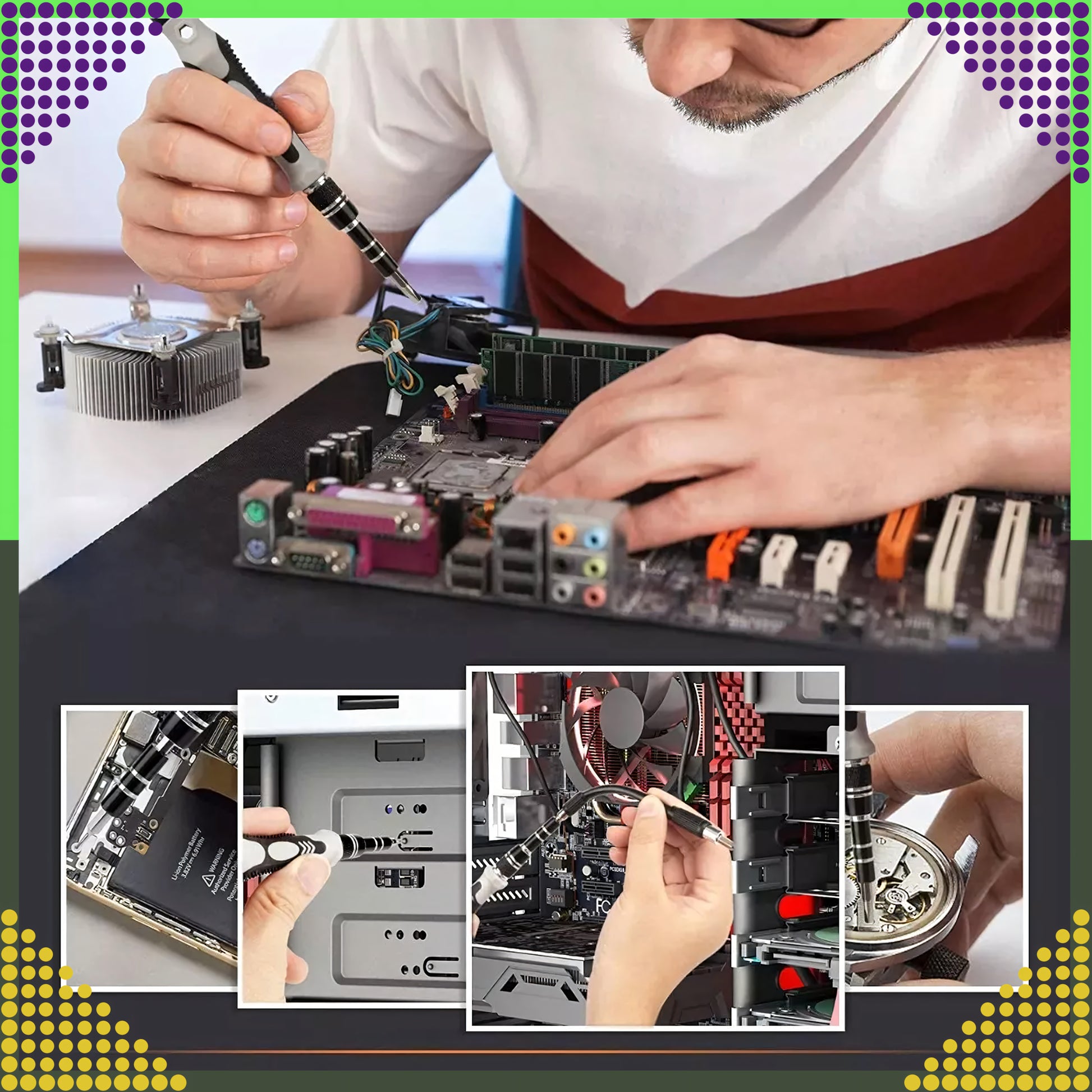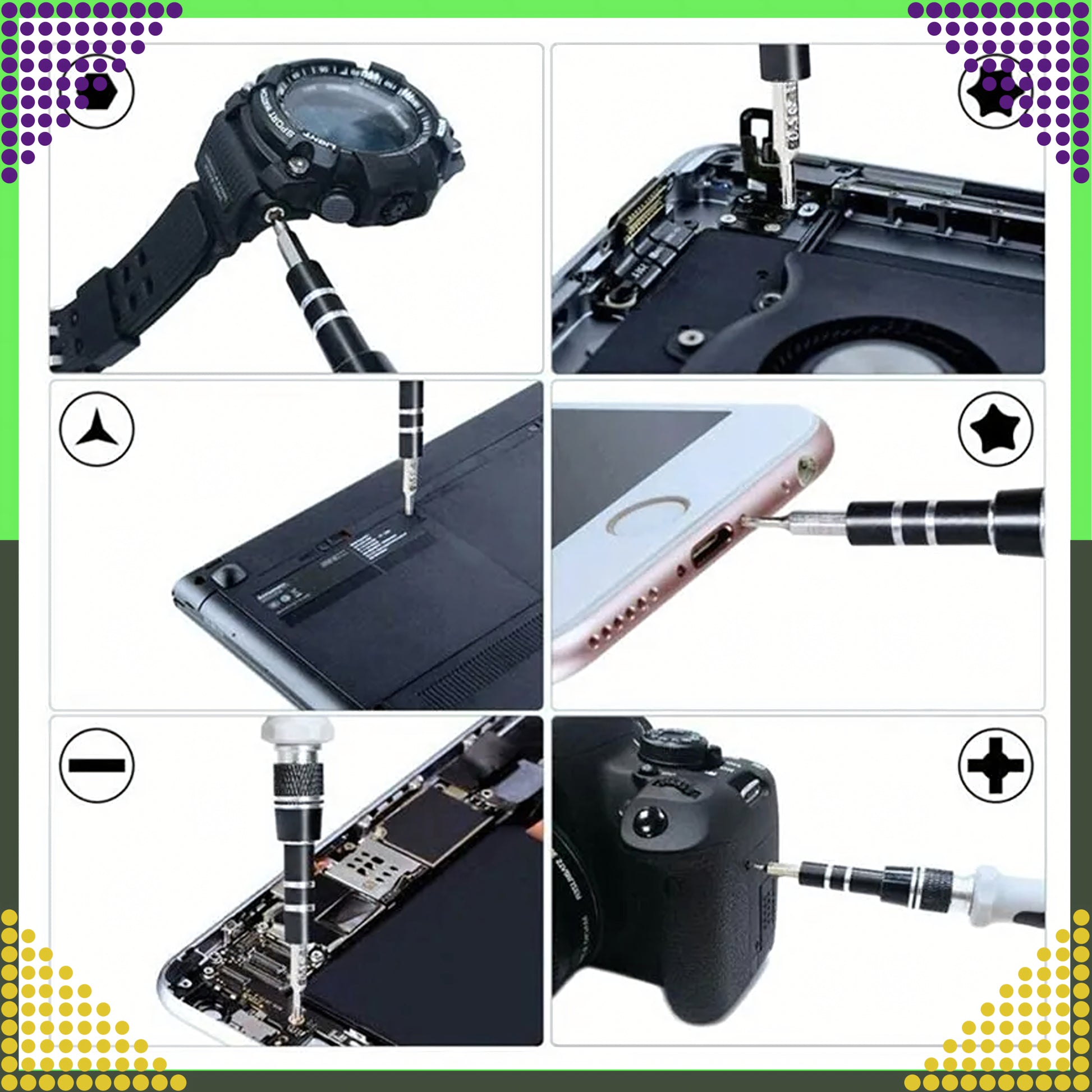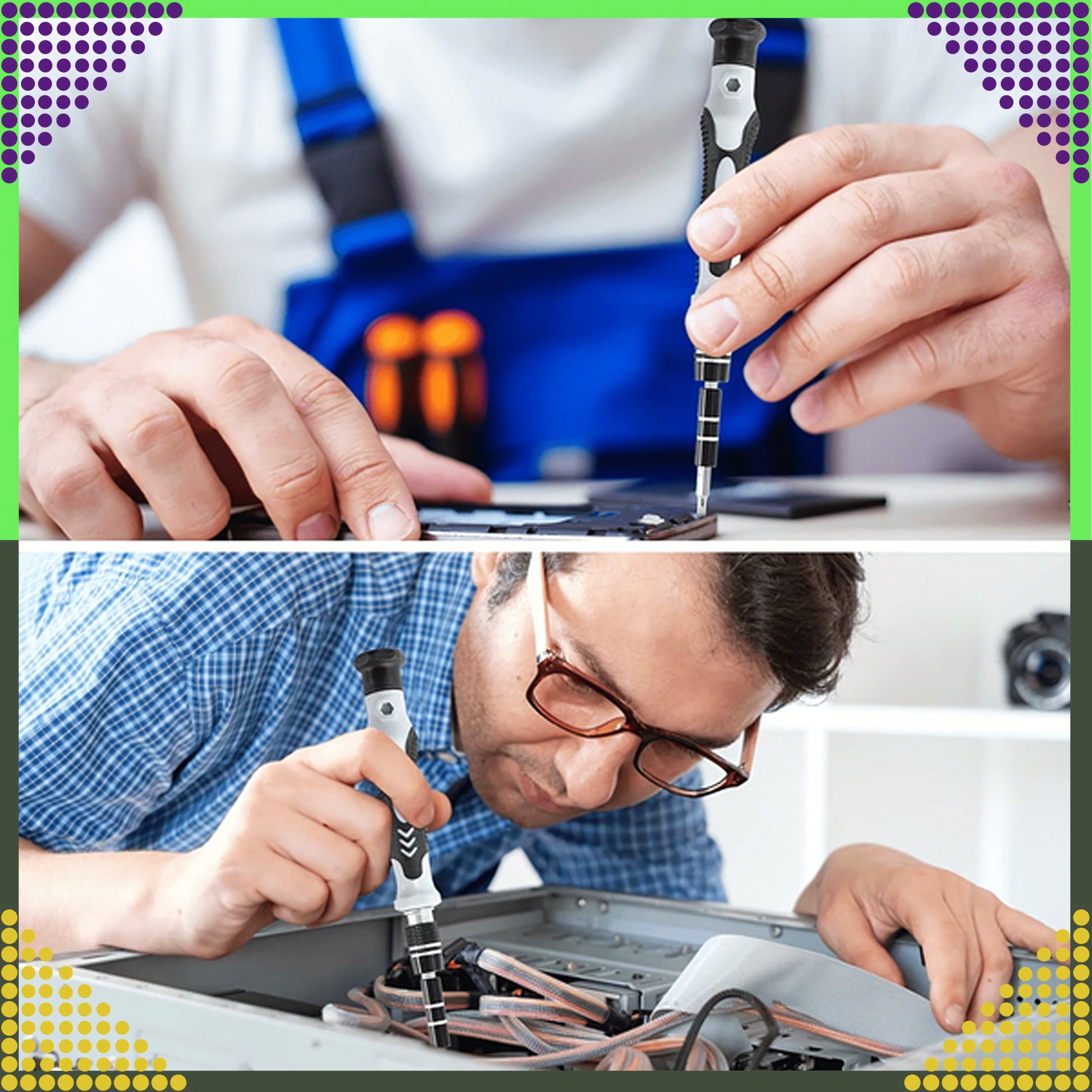 Mitmekülgne 115-osaline täppiskruvikeerajate komplekt katab enamiku peenmehhaanika ja elektroonika töödest: telefonid, sülearvutid, konsoolid, kaamerad, prillid, kellad, väikeseadmed. Magnetiseeritud otsikud hoiavad kruvid kindlalt, ergonoomiline käepide on libisemisvastane ning kaasas on nii jäik kui ka painduv pikendus raskesti ligipääsetavate kohtade jaoks. Kõik on kompaktse kandekarbiga korras ja käepärast.